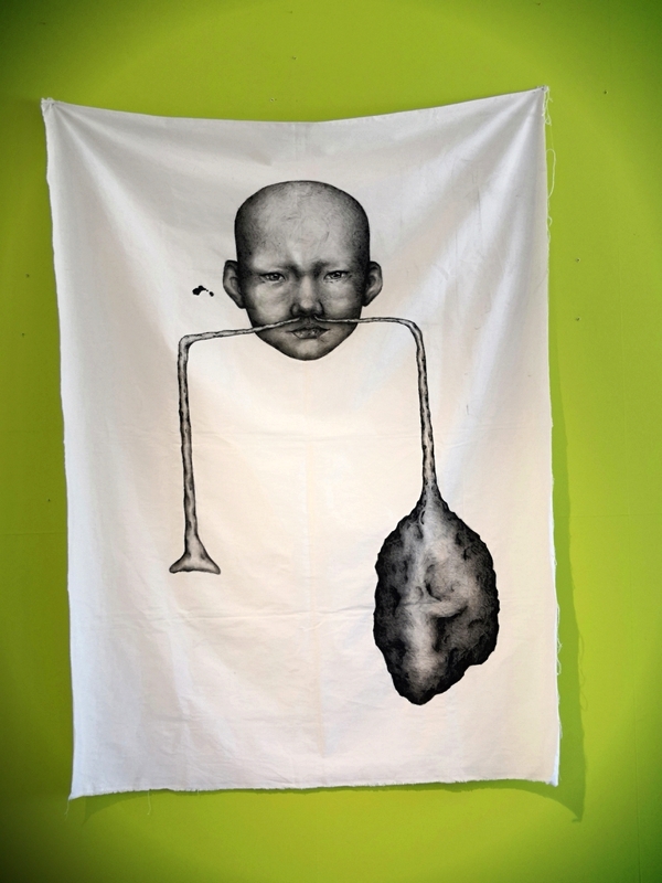 – Аружан Жумабек в 24 года уже является сильным графиком. Работа, представленная в экспозиции, создана из пигмента по авторскому рецепту художника. Через анатомию человека Аружан препарирует эмоции, потери и приобретения.