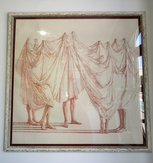 Известный художник Бейбит Асемкул представил на выставке несколько произведений из серии “Инфинити” (“Бесконечность”). Это “Сестры”, держащие в руках простыню и обращающиеся к небу. Автор передает идею единения семьи под крылом матери, недавно покинувшей земной мир. Это и образ единения народа через культуру, традиции. Горы – отсылка к детству Бейбита среди гор Алматинской области. Продолжает тему работа “Братья”, где также изображены родные художника, выросшего в многодетной семье.