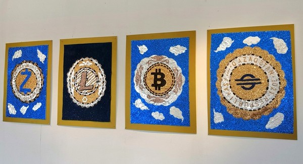 Интересны работы Кати Кан, родившейся в Алматы, а в 5-летнем возрасте переехавшей в Лондон. Художница запечатлела образы биткойнов в казахском контексте – золоте, орнаментах, передав идею глобализации, взаимовлияния Востока и Запада, стирания границ и граней между странами, нациями, экономикой и культурой. Не осталась без внимания автора и тема пандемии. На полотне “The conspiracy chart” вы найдете и летучих мышей, и инъекции препаратов, и отсылку к конспирологическим теориям заговора, согласно которым коронавирус создан искусственно, и даже отсылку к Оскару Уайльду. Героями работы стали и современный Обломов, а также сама художница.