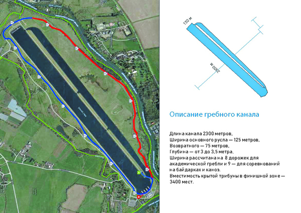 Занимаемая площадь самого канала, обводного русла и инфраструктуры должна быть не менее 80 гектаров земли. Основное и обводное русла – длиной не менее 2 300 метров, больше можно, меньше нельзя. Ширина основного канала – минимум 125 метров, возвратного – 75 метров. Глубина канала не менее 3 метров при стандарте в 3,5 метра. Ширина канала рассчитана на 9 дорожек. Вместимость крытой трибуны в финишной зоне – 3 400 мест.