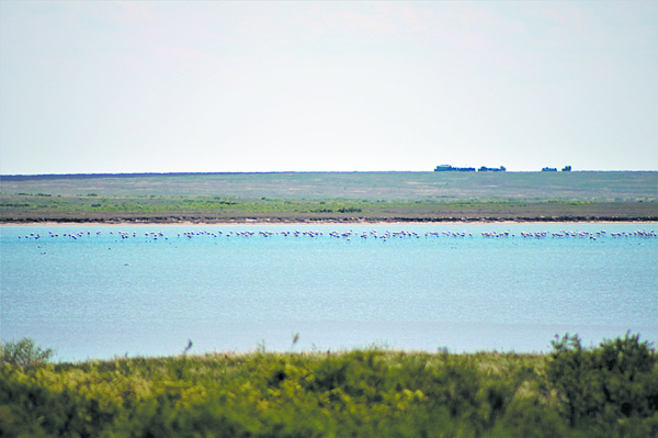 Но, конечно, главный объект всеобщего наблюдения – это фламинго. Озеро Тенгиз является для них самой северной точкой гнездования. Ехать от визит-центра до Тенгиза – более 70 километров по глинистому грейдеру, если повезет и птица будет ближе к северному побережью, и еще дальше, если она решит отдыхать на любом другом берегу озера. Нам повезло просто сказочно – небольшая колония фламинго решила прилететь в этот раз на одно из ближайших для наблюдения озер, так что спустя всего час езды по пыльной дороге мы увидели их.