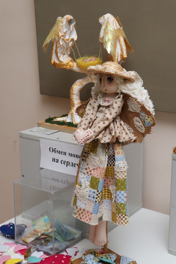 Мастера безвозмездно передают проекту свои творения – скульптуры, кукол, картины, работы из бисера, ювелирные украшения. Постоянный участник выставки ювелир Александр МИТРОФАНСКИЙ считает “Кота” ангелом. А мастерица Татьяна ДУДАРЬ – “Таксу”. “Солнечный зайчик” Галины МЕШАРИНОЙ, “Кукла-щекастик” Ольги БЕЛЯКОВОЙ, “Ангел в шляпе” Натальи САФРОНОВОЙ, “Осенняя озорница” Анны МАРЧЕНКО – ангелы такие разные!