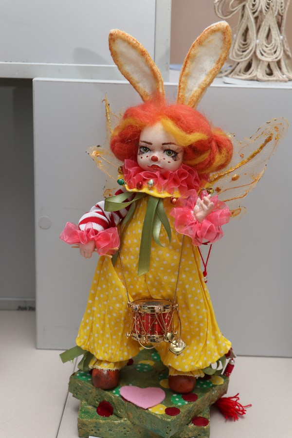 “Музыкальный ангел” Алины играет на арфе, задавая настроение окружающим. Работа Айши – “Ангел миров инь-янь” из полимерной глины. Мастерица немногословна. Зато ее папа рассказал, что способности к творчеству у дочери открылись в 3 года: