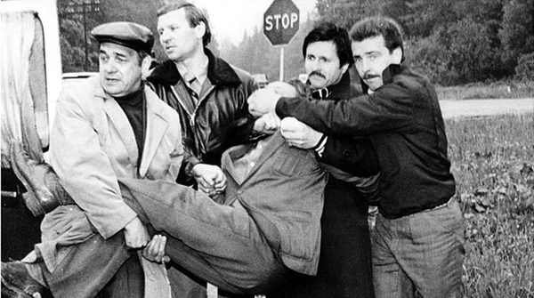 – Гримировали меня профессионалы на “Мосфильме”, – рассказывает майор. – Надели парик, нос приклеили, подбородок. Мне показали короткие кадры с захватом Толкачёва, чтобы я изучил его походку. На меня одели его одежду. Соблюдал все условности: плащ через руку, в правой – книжка, в которой Толкачёв передавал материалы.