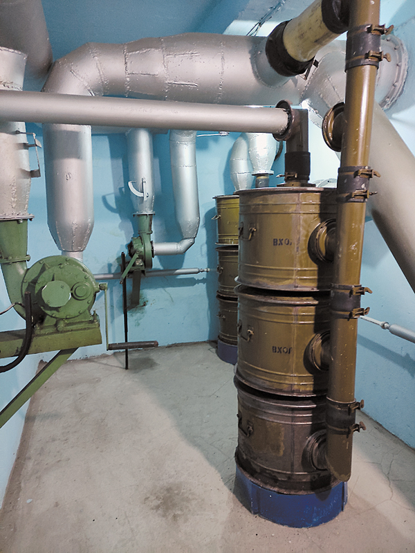 Соседняя комнатка оказывается еще теснее, чем основная. Здесь по стене к потолку плетутся змеевидные толстые трубы, выкрашенные серебрянкой с зелеными “коленами” и дополненные бочками цвета хаки. Это не инсталляция, а вентиляция. Дальше еще одна комнатка – еще меньше предыдущих, и запасной выход.