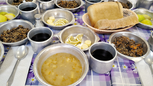 О том, что эта столовая все-таки не ресторан, настойчиво напоминает сервировка. Металлические чашки и ложки. Вилок и ножей нет. Их легко могут превратить в холодное оружие, впрочем, как и неметаллическую посуду.