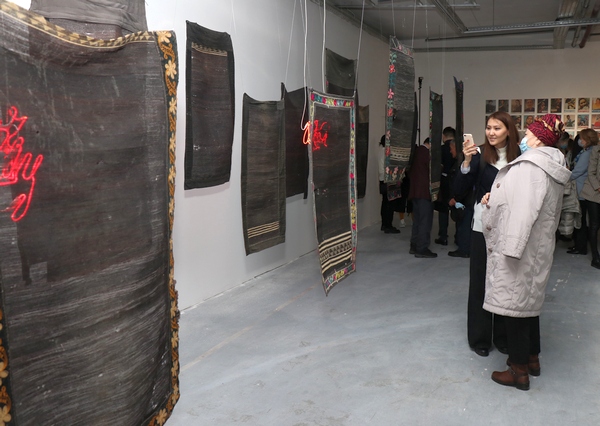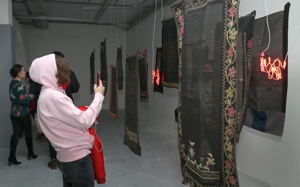 В галерее минимум освещения. По всей комнате развешаны 40 черных чачванов различных размеров и качества исполнения. С заплатками, заштопанными элементами. С соляными разводами от пота и слез – свидетелей жизни хозяек.