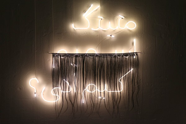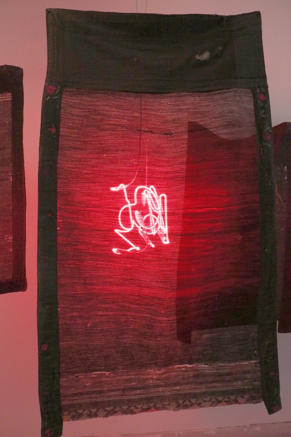 Их подсвечивают красные неоновые объекты в виде надписей женских имен, выполненных на арабице, кириллице и латинице, – это алфавиты, что менялись 6 раз в течение XX века на территории Узбекистана. Идея пришла художнице, потому что так писала, смешивая буквы, ее бабушка. Неон для нее абсолютно живой материал, стекло – свет, а кино – это тоже свет.