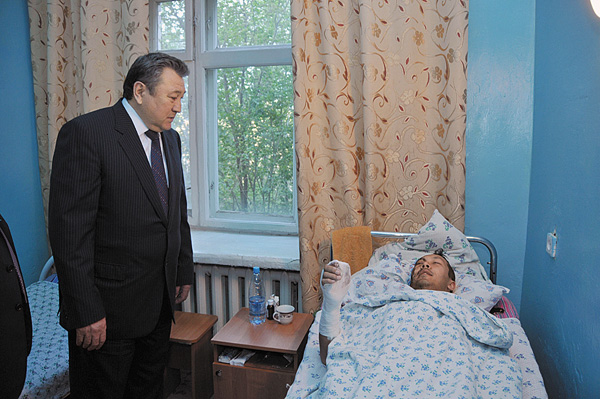 Известие о теракте (который власти долгое время отказывались признавать таковым) застало акима Сагиндикова за рубежом, где он проводил отпуск. Глава региона срочно вылетел на родину и приехал в больницу к Женисбеку Молдину.