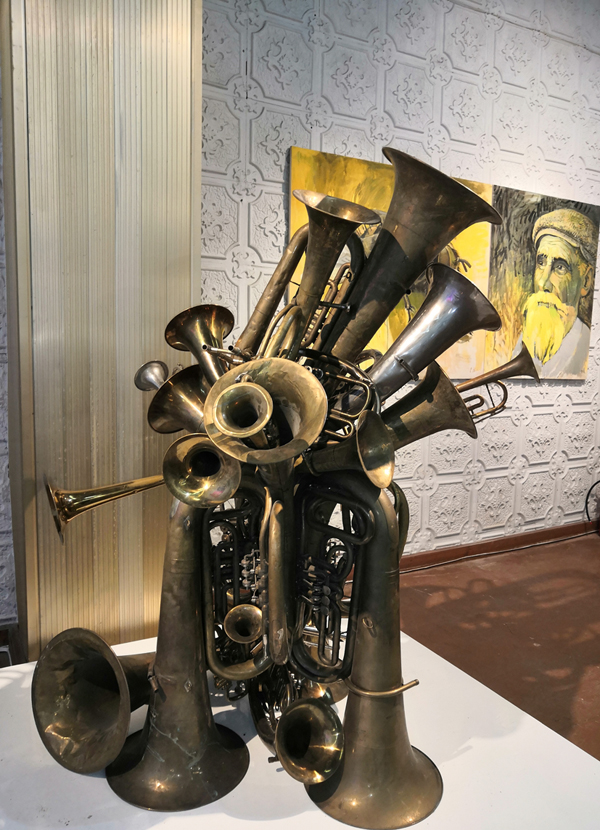 Антураж экспозиции прекрасно дополнили вороны на люстре и полу арт-завода. В этом образе прослеживается отсылка к знаменитым “Птицам” Аристофана. Вписался в выставочную среду и “Кабинет министров”, ассорти из музыкальных инструментов, создающее какофонию, символизирующий хаос и разрозненность действий чиновников по принципу “кто во что горазд”.