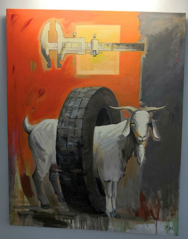 – В работе “Колесо” автор запечатлел козу, символ традиционного уклада сельской жизни, и шину, знак индустриализации. В современном мире эти 2 начала пересекаются, но не всегда получается сбалансированное влияние.