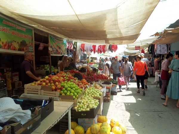 Продуктовый рынок на свежем воздухе в составе “Старого базара” называется “Сыбага”, и я решаю посетить его, дабы купить овощей, пучок мяты, немного помидоров и свежих ягод. Вызываю такси, беру корзину. Поехали!