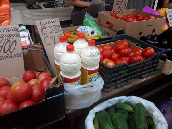 Наконец, я всё же подхожу к тесным продуктовым рядам. И постепенно начинаю ощущать себя Алисой в Стране чудес. Некоторые картинки с рынка почти сюрреалистичны. Между лотками с продуктами – прилавки с хозтоварами, мелкими шмотками типа трусов, аксессуаров. На прилавке с солнечными очками почему-то лежат еще и говяжьи ножки, хоть сейчас бери на холодец. За прилавком с носками стоит столик, с которого торгуют упакованной в целлофановые мешки бараниной. Следом идет лоток с хозяйственной мелочью, среди которой замечаю отраву от грызунов, муравьев, мух и тараканов. На развале с пшеном и талканом стоят еще и пластиковые бутылки с молоком, причем сами бутылки старые, из-под газировки, и, видать, использованные уже не раз, такие затертые. Ну и товарное соседство! У нас в городе еще существует санэпиднадзор или уже погиб в неравной борьбе с безграмотностью и безрассудством торгового класса?