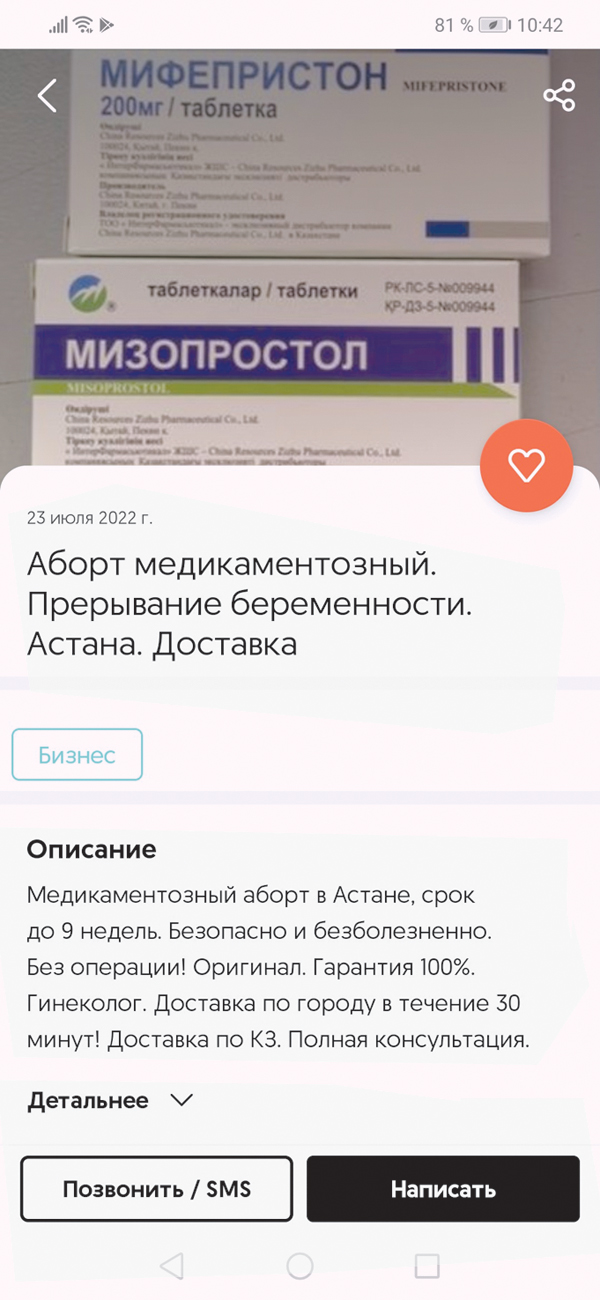 Таблетки стоимостью 15–18 тысяч тенге для аборта вам привезут за полчаса, доставка – в любую точку страны. Подлинность и безопасность препарата гарантируют люди, допускающие в слове “гинеколог” три ошибки. Другие прямо заявляют: “Мы только продажники, просто отправляем препарат”, словно речь идет об аспирине.