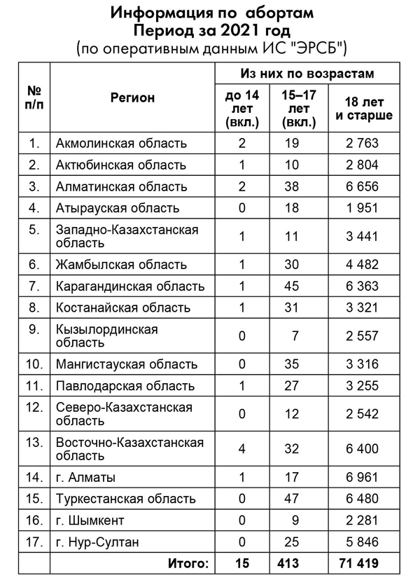 По данным минздрава, в прошлом году в Казахстане было зарегистрировано 71 847 абортов, из них до 14 лет – 15 случаев, от 15 до 17 лет – 413 случаев, от 18 лет и старше – 71 419 случаев.