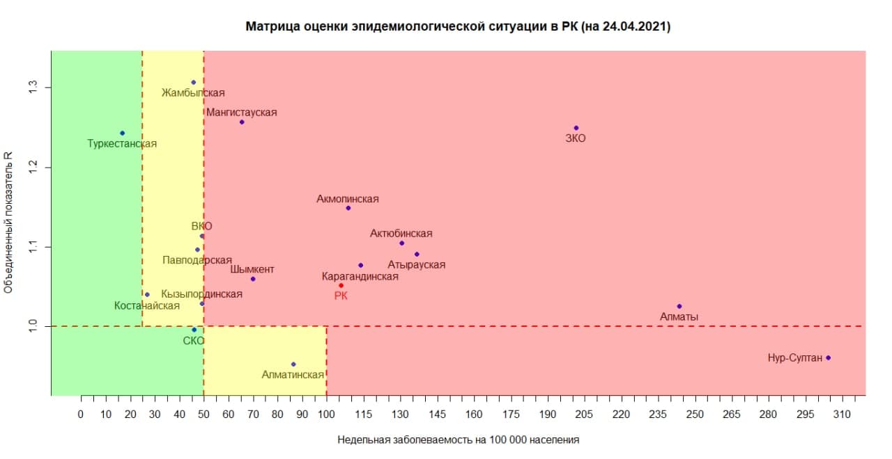 Матрица оценки эпидемиологической ситуации в регионах Казахстана на 24 апреля выглядит так: