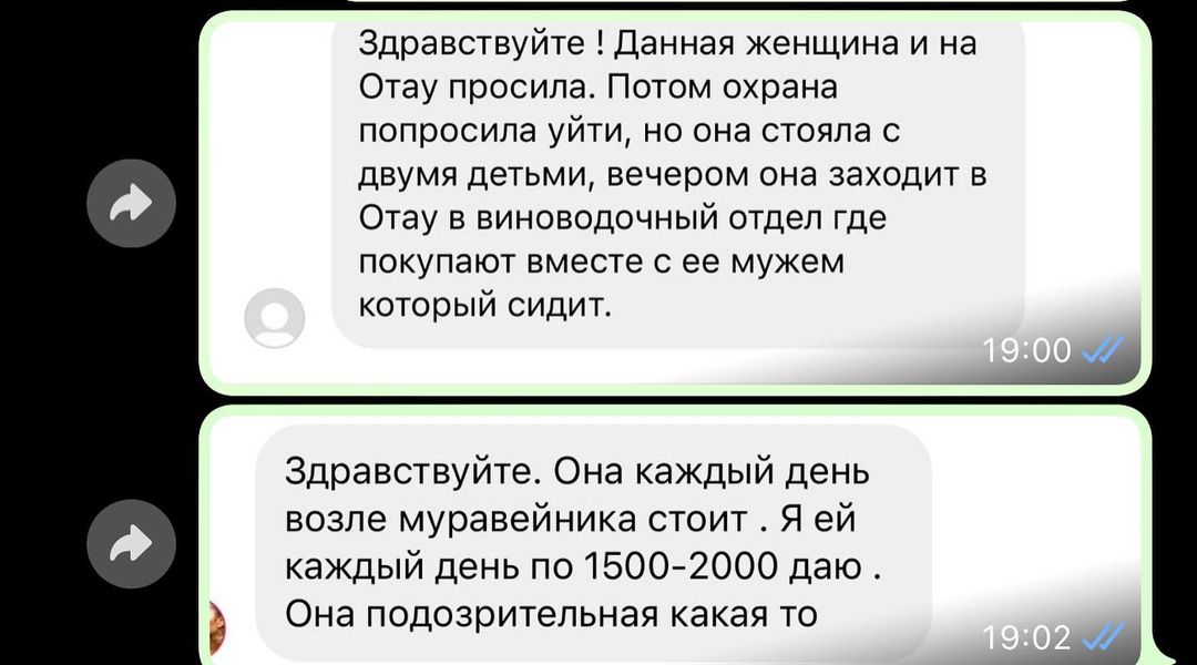 С собой у нее была подготовленная табличка "Помогите собрать на билет до Костаная ради ребёнка". Уже на тот момент мы поняли, что фраза «ради ребёнка» — чистой воды спекуляция.