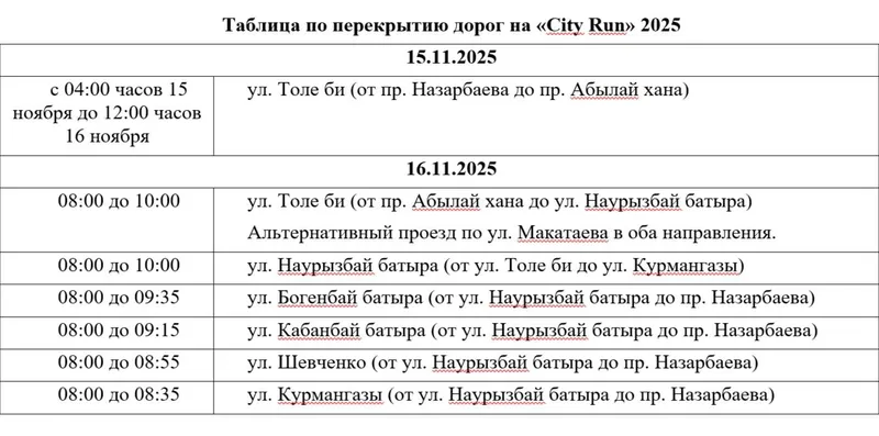 16 ноября в Алматы состоится финальный забег сезона – City Run, организованный корпоративным фондом «Смелость быть первым». Оргкомитет City Run информирует жителей и гостей южной столицы о том, что в день забега движение на отдельных участках дорог будет частично ограничено.