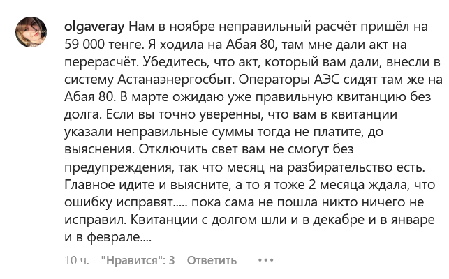 "Ситуация такая, в феврале через Kaspi получили квитанцию, каково было мое удивление, когда за электроэнергию начислили 166 000 тг, это просто ужас, всегда платили исправно, долгов нет и тут такая сумма. Вызвали контролёра, он посмотрел, выписал акт, что счётчик работает исправно, что "Астана РЭК" неправильно сделали расчёт!" — говорится в подписи к фото с квитанцией.