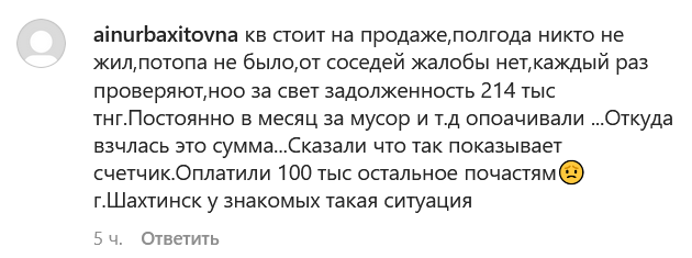 На эту проблему пожаловались другие астанчане и даже владелица квартиры в Шахтинске. Им начисляют до 200 тысяч необоснованной переплаты, причем это происходит систематически в течение нескольких месяцев. Некоторые отмечают, что оператор самостоятельно не исправляет ошибки и сделать это онлайн возможности также нет.