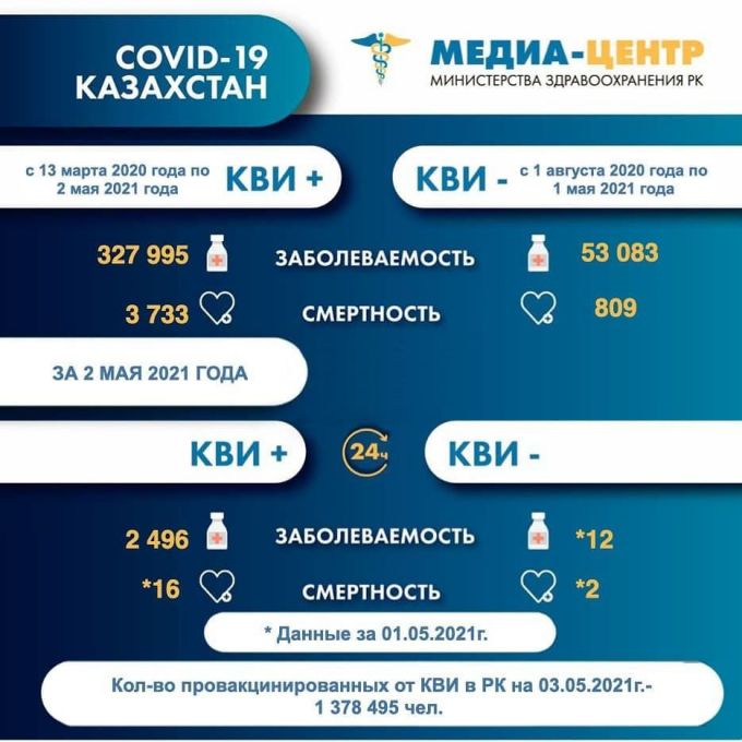 На 1 мая 2021 года зарегистрировано 12 новых случаев заболевания, 2 случая с летальным исходом. Выздоровели 65 человек. Алматинцев начали вакцинировать в мечетях и храмах