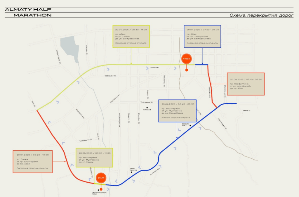 Старт дадут в 07:00 в парке первого президента, далее маршрут проходит по проспекту Аль-Фараби и финиширует на Центральном стадионе.