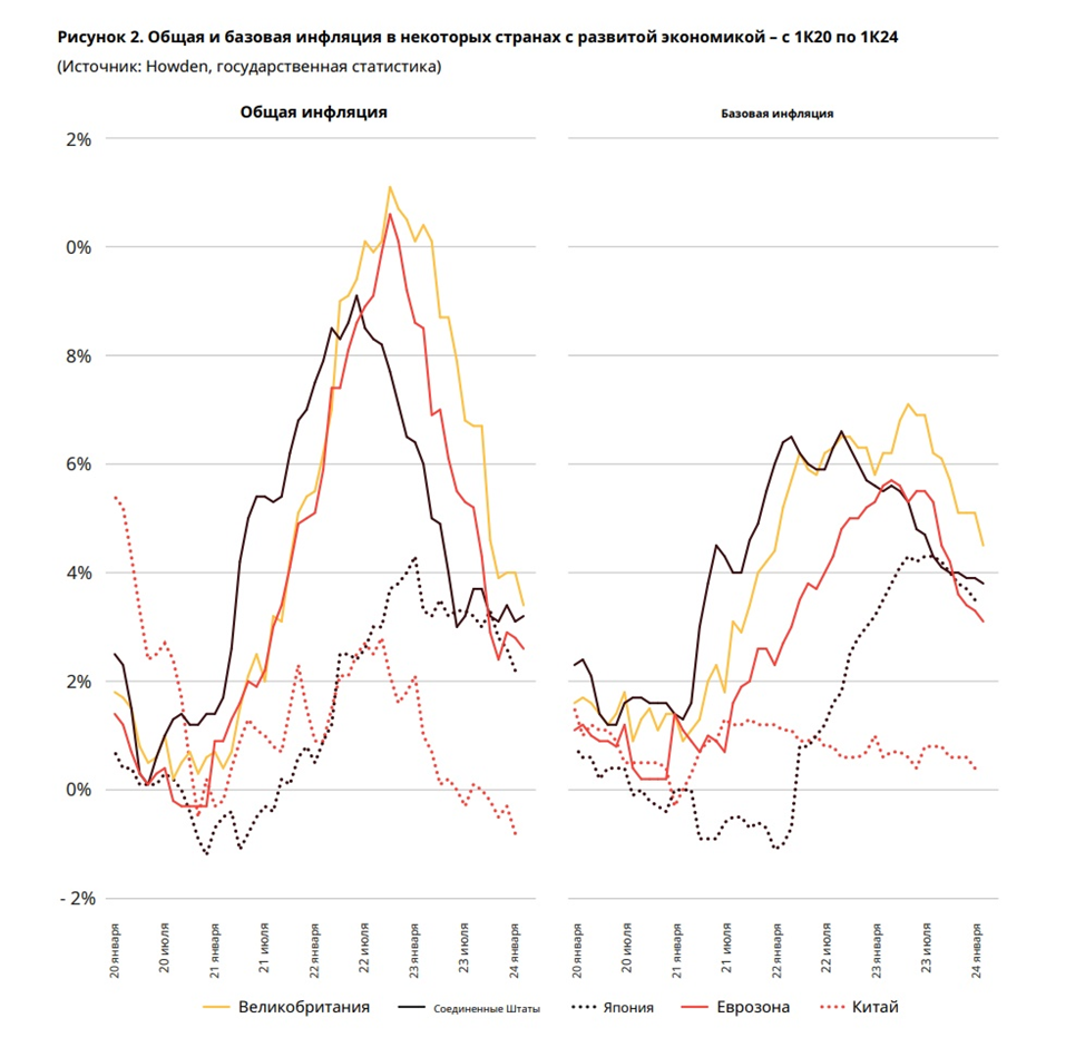 Высокая инфляция подстегивает рост стоимости жизни, сдерживает экономический рост и приводит к росту страховых выплат. На рисунке 2 показаны тенденции инфляции в крупнейших экономиках с 2020 года. Основные показатели прошлого года быстро упали с многолетних максимумов (за исключением Китая). Базовая инфляция, исключающая продовольственные и энергетические компоненты, остается нестабильной.