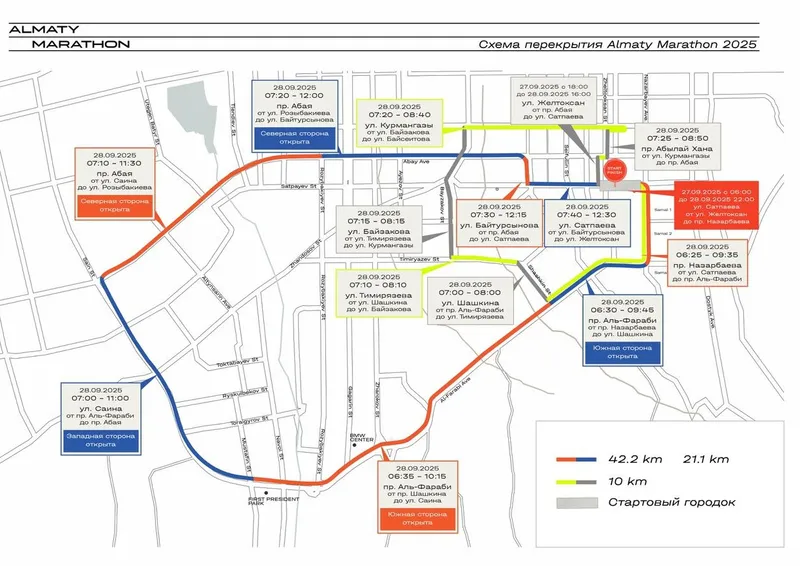 Cтарт и финиш марафона будет расположен на Площади Республики, поэтому по ул. Сатпаева от ул. Желтоксан до пр. Назарбаева будут перекрыты обе полосы движения с 6:00 27 сентября до 22:00 часов 28 сентября.