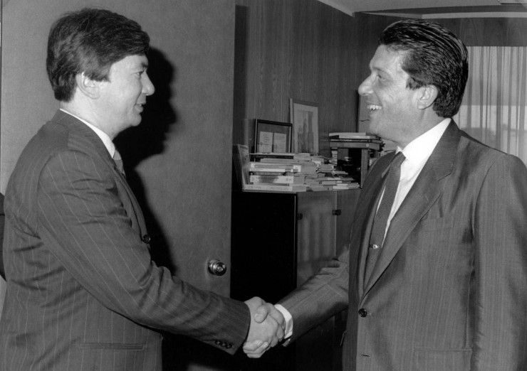 Совместное фото показывает Токаева и генерального директора ЮНЕСКО Федерико Майора после церемонии подписания акта о вступлении Казахстана в ЮНЕСКО 22 мая 1992 года.