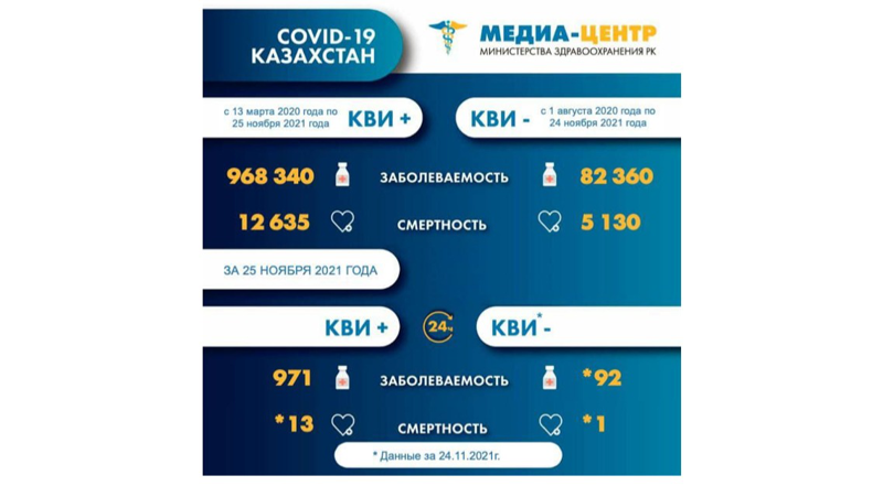 Опубликована информация о заболеваемости коронавирусной инфекцией в РК на 26 ноября 2021года, сообщает Caravan.kz..