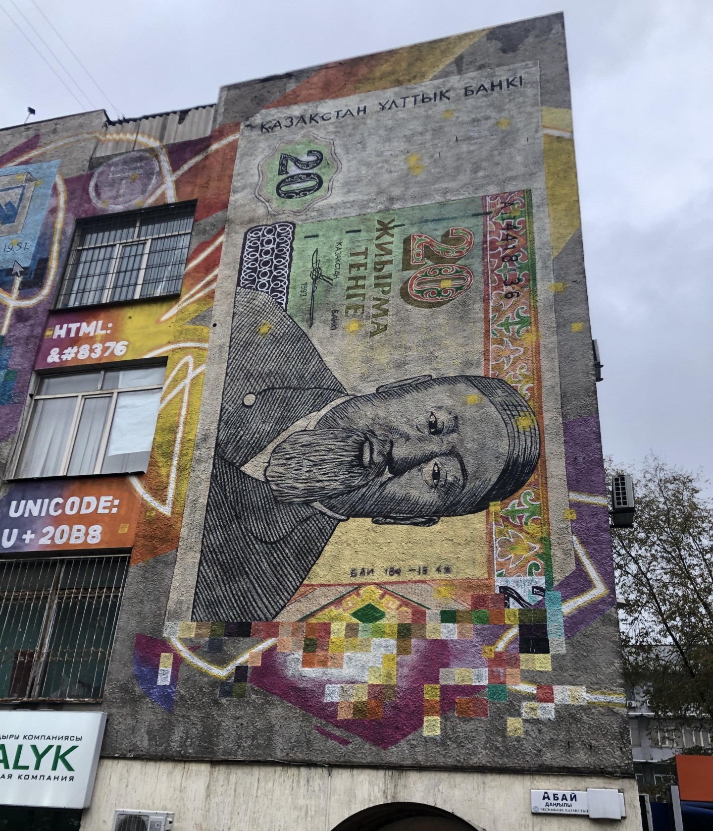Сначала все казахстанские деньги были бумажными, монеты появились далеко не сразу. На тиынах были изображены цифры и различные декоративные элементы, тенге были посвящены выдающимся личностям. Этот дизайн создавался художниками вручную с помощью традиционных материалов и настолько запомнился казахстанцам, что позже его запечатлели в нескольких муралах. Например, так выглядит граффити с 20 тенге в Алматы. На обороте у тех купюр были разные изображения — здания, природные красоты, беркутчи.