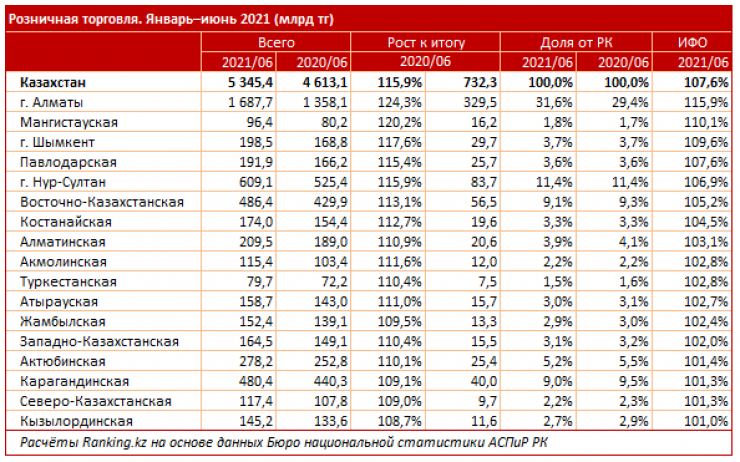 Помимо Алматы, наибольший годовой рост объема розничной торговли был также отмечен в Мангистауской области — на 10,1 процента до 96,4 миллиарда тенге и Шымкенте — на 9,6 процента до 198,5 миллиарда тенге.