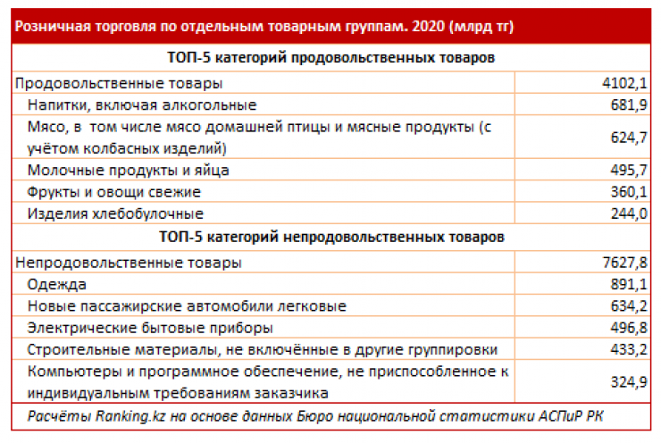 В 2020 году объем розничной торговли составлял 11,7 триллиона тенге, что на 3,6 процента больше в стоимостном выражении, чем годом ранее. Из них 35 процентов, или 4,1 триллиона, составили продукты питания. Наибольшие объемы в розничной торговле пришлись на напитки, включая алкоголь (681,9 миллиарда тенге), мясо (624,7 миллиарда тенге), молочные продукты и яйца (495,7 миллиарда тенге).