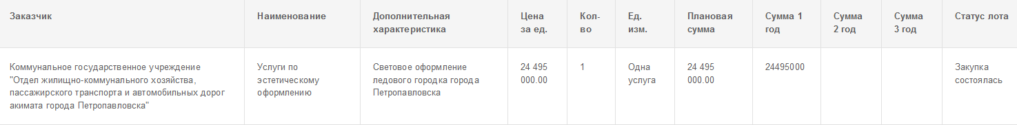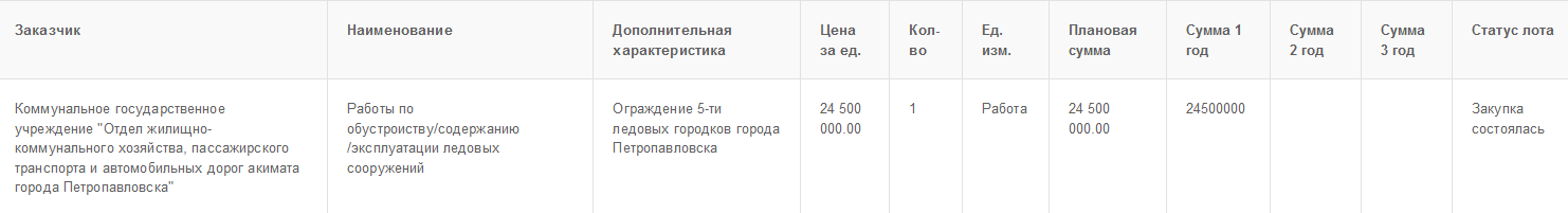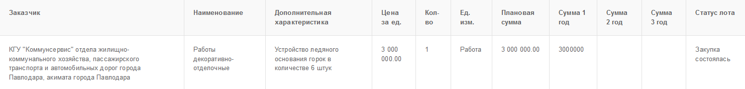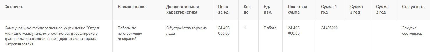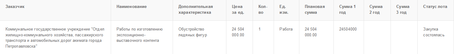 Такие лоты действительно появились на сайте госзакупок. Более того, сумма по 5 лотам составляет не 75, а более 100 миллионов тенге. В работу входит обустройство горок и фигур изо льда, а также ограждение и световое оформление ледовых городков. При этом устройство ледяных оснований для горок выделено в отдельный лот за 3 миллиона тенге.