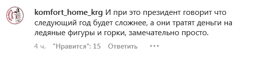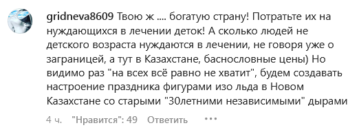 "В стране система теплоснабжения вся гнилая, а они лепят фигуры за 75 миллионов 🤦🏻♂️. Очнитесь уже вы все там! В СМИ появилась информация, что в Петропавловске хотят потратить 75 миллионов тенге на ледяные фигуры и горки. Петропавловцев, наверное, удивит такая щедрость властей при подготовке к зимним праздникам?! 75 миллионов тенге чиновники решили потратить на ледяные конструкции. Пять лотов около месяца назад разметили на сайте госзакупок. Конкурс завершён, и через неделю подрядчики приступят к работам. Как рассказали в городском акимате, скульптуры художественной резки с внутренней подсветкой должны появиться в пяти частях города. В данную сумму входит 5 горок, также ледяные фигуры в количестве 44 штуки, также световое оформление и различные конструкции изо льда.