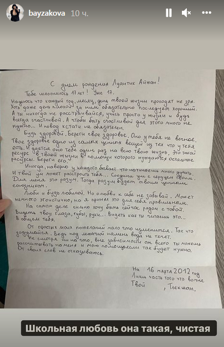 В первом письме, датированном 2012 годом, юноша поздравляет Айжан с семнадцатилетием.