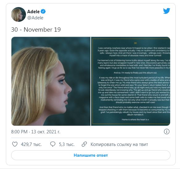 — За это время я узнала о себе горькую истину. Я избавилась от множества оков, но попала в новые. Находила разумную истину, а затем вновь начинала следовать своим чувствам. И прошла так много, что уже могу сказать, что никогда не чувствовала себя более умиротворенной. И, наконец, я готова представить свой альбом. Создание этих песен пришлось на бурный период моей жизни. Когда я сочиняла их, со мной рядом был друг, который приходил ко мне с бутылкой вина и едой на вынос, чтобы подбодрить. Мой мудрый друг всегда давал лучший совет. Тот, кто держит тебя за руку ночи напролет , — сообщила Адель.