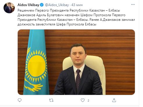 — Решением Первого Президента Республики Казахстан – Елбасы Джанзаков Адиль Булатович назначен шефом Протокола Первого Президента Республики Казахстан – Елбасы. Ранее А. Джанзаков занимал должность заместителя шефа Протокола Елбасы, — сообщил Айдос Укибай.