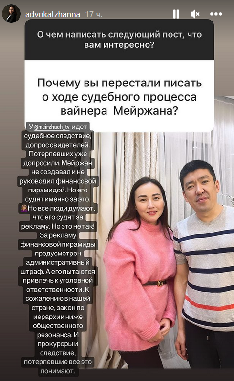 "У Мейржана идет судебное следствие, допрос свидетелей. Потерпевших уже допросили. Мейржан не создавал и не руководил финансовой пирамидой. Но его судят именно за это.