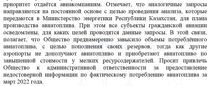 Второй аргумент состоял в том, что запрос поступил 4 апреля, а отчеты даются по 10 число включительно, сведения были предоставлены по предварительным отчетам. Также представитель Air Astana отметил, что в запросе не было указано, о местных или международных рейсах нужная информация, поэтому данные были по обеим категориям перелетов. Суд счел, что эта позиция неаргументирована, и привел в пример компании Scat и Qazaq Air, расчеты которых совпали с фактическим потреблением топлива их самолетами.