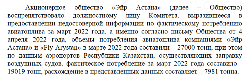 Надзорный орган выяснил, что, хотя самолеты Air Astana и ее дочерней компании Fly Arystan потребили в марте 2022 года 19 019 тонн топлива, в документах сотрудники компаний указали общее число 27 000 тонн. Таким образом, расхождение составило 7981 тонну.