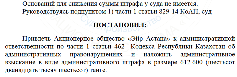 Поэтому суд назначил компании Air Astana штраф размером 200 МРП (612 600 тенге на тот момент).