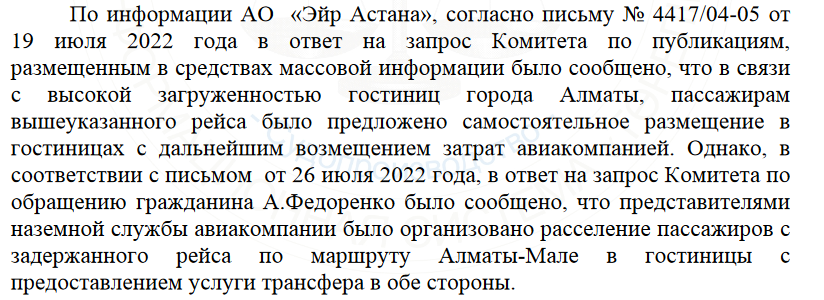 Однако представителю Комитета гражданской авиации в Air Astana сообщили, что сотрудники компании не только расселили пассажиров задержанного рейса по гостиницам, но и организовали трансфер в обе стороны.