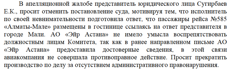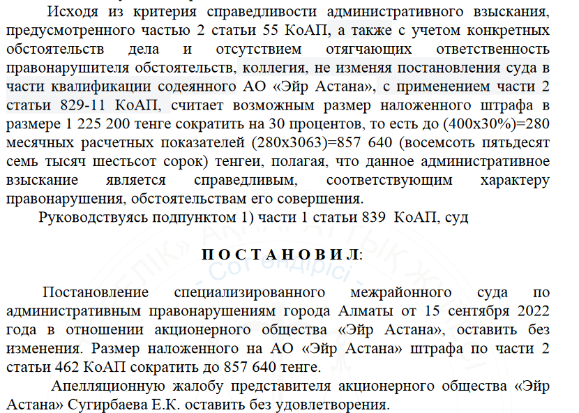 Суд отклонил апелляцию Air Astana, однако все же пошел на уступки и сократил размер штрафа на 30 %, с 1 225 200 тенге до 857 640 тенге.