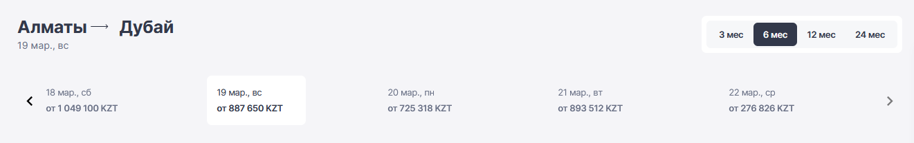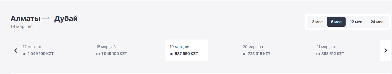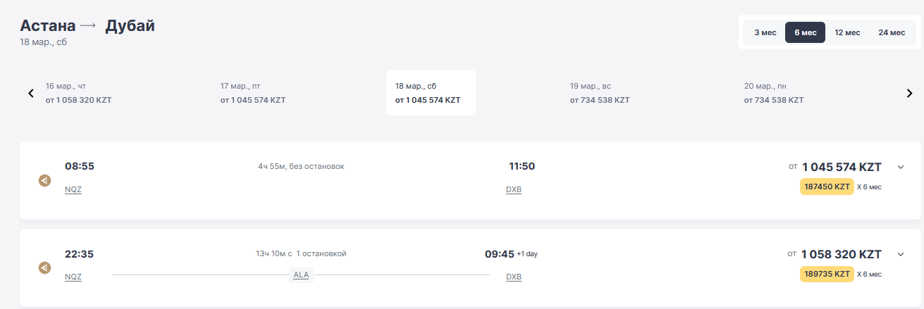 Перелет на 17 или 18 марта для взрослого с ребенком до 11 лет будет стоить более миллиона тенге. Билеты на 19 марта будут стоить на 161 450 тенге дешевле, а на 20 марта — уже на 323 782 тенге меньше. Далее цена снова вырастает, возможно, в связи с началом Наурыза, но до миллиона все еще не дотягивает, а 22 марта и вовсе падает до 276 826 тенге — разница огромная.