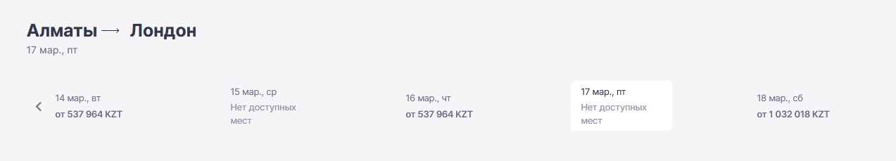 Самый дешевый перелет в Лондон 14 или 16 марта обойдется в 537 964 тенге, но 18-го цена подскакивает почти в 2 раза и составляет больше миллиона. Вылет 19 или 21 марта будет стоить ощутимо дешевле — разница составит 400-500 тысяч.
