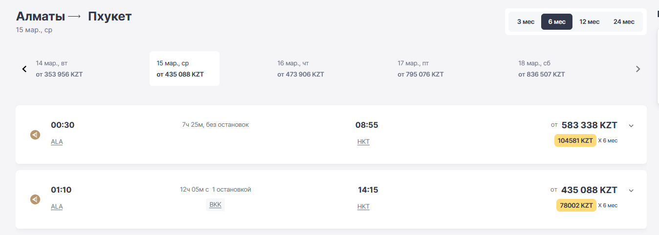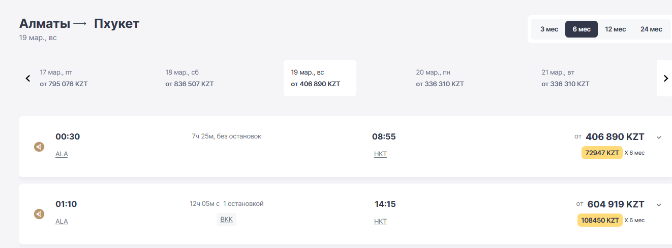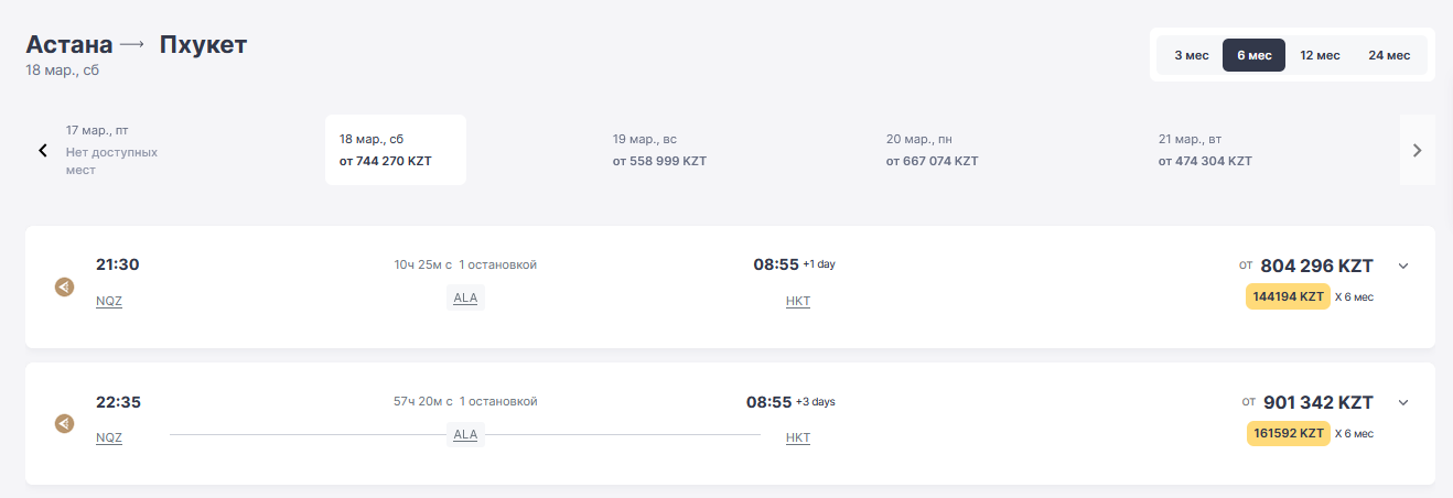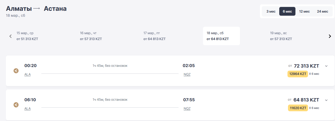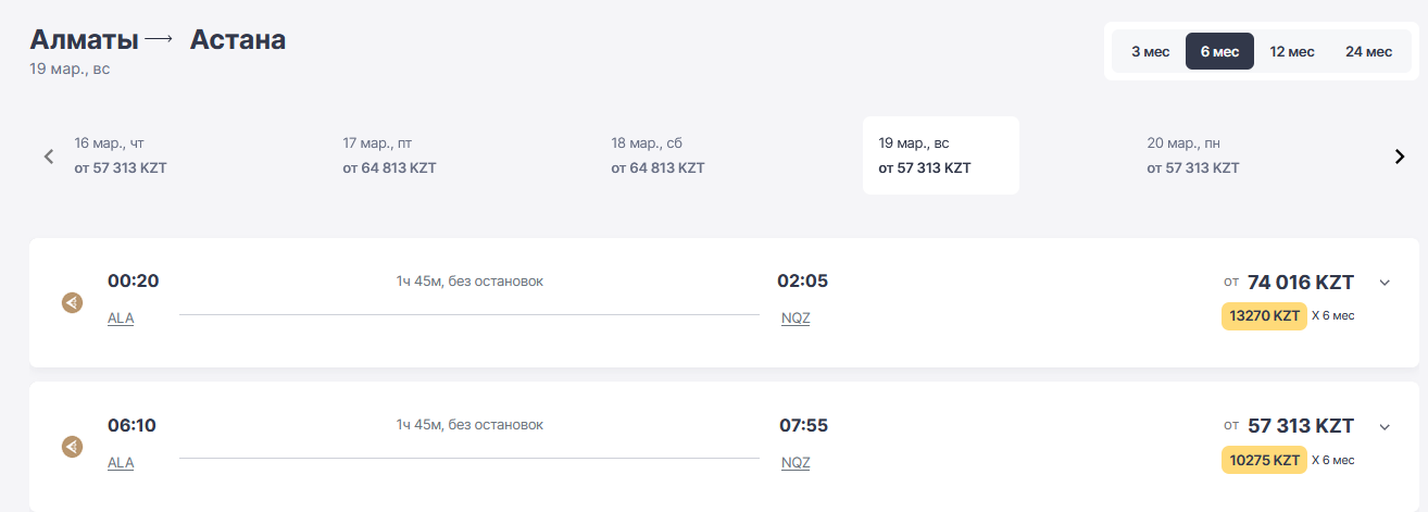 Стоимость билетов на перелет из Алматы в Астану поднимается постепенно: на 15 марта они стоят 51 313 тенге, на 16 число — 57 313, а на 17, 18 и 19 — уже 64 813. То есть наблюдается скачок сначала на 6 тысяч, а потом еще на 7,5.