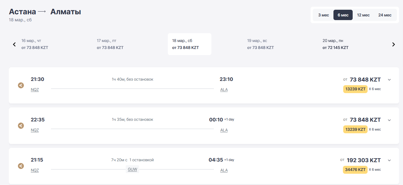 Перелет из Астаны в Алматы обойдется минимум в 73 848 тенге в любой день с 16 по 19 марта, но 20-го цена падает на 1 703 тенге.
