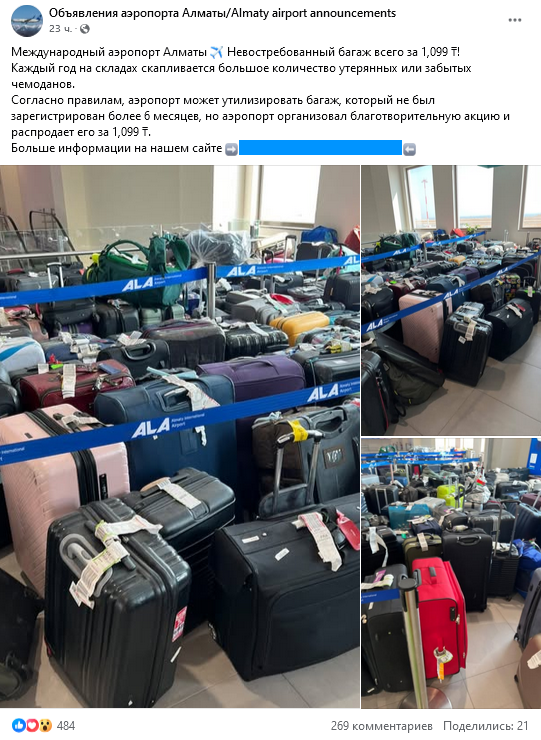 Всем желающим было предложено приобрести забытые чемоданы по 1099 тенге за единицу, при этом в объявлении была ссылка, ведущая на сайт, не принадлежащий алматинскому аэропорту. Возможно, при попытке приобрести чемодан через данный неустановленные лица могли получить доступ к финансовой информации покупателей и использовать ее в своих целях.