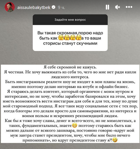 "Вы такая скромная, порою надо быть как другой блогер, а то ваши сторисы станут скучными", — такое сообдщение прислали Айсауле в Instagram.